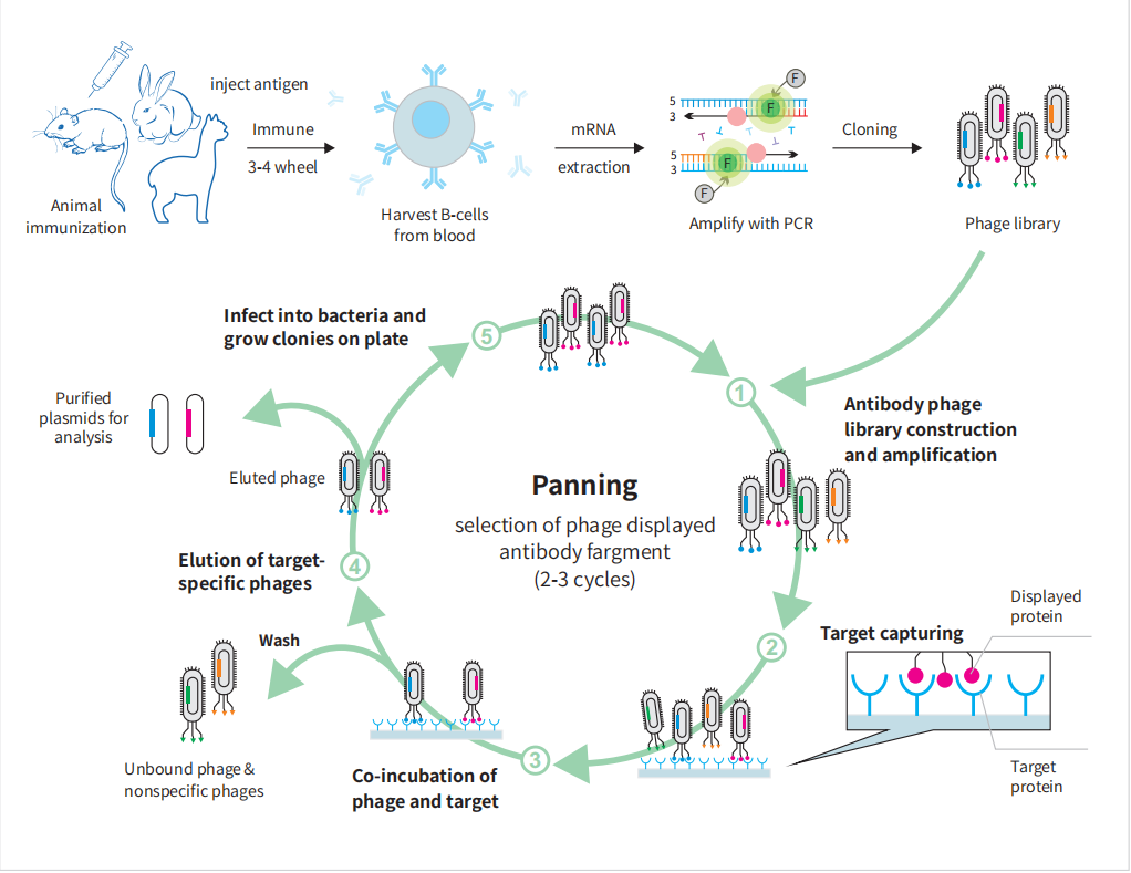 噬菌体展示技术通过将外源肽段和噬菌体衣壳蛋白融合展示于噬菌体表面,进行高通量筛选及富集,并对所需功能的克隆进行定性分析,该技术展示对象涵盖抗体、抗体片段、肽段、c......